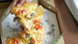 4K footage Close-up Top view, ฺBoy is holding a slice of pizza with tomato and cheese, pizza is cut in half and is placed in a cardboard box.