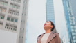 Asian businesswoman exploring the dense urban cityscape during her midday lunch break, in Hong Kong in the Greater Bay Area. Professional lifestyle, city discovery, and a refreshing pause amid a busy workday