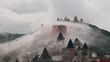 October 2, 2024 Danang, Vietnam Breathtaking aerial view of a majestic castle atop a mist-covered mountain, surrounded by lush greenery and soft clouds, creating a mystical and enchanting atmosphere.