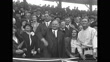 Title card: "Baseball War Rages on Wide Front -- In Chicago, National League champion Cubs battle with Pittsburgh Pirates -- Mgrs. Hornsby and Ens exchange greetings" / high angle spectators in stadium seats / MS Pittsburgh Pirates manager Jewel Ens shakes hands with Chicago Cubs manager Rogers Hornsby and they wish each other luck / high angle game with batter running to first / high angle pitcher throwing ball / batter running toward first / high angle spectators in seats / high angle two players running home // Intertitle: "In Washington, World champion Athletics play Walter Johnson's Senators with Hoovers as rooters" / Washington Senators manager Walter Johnson crouching talks to team in dugout then all players stand and start toward field / President Herbert Hoover with Johnson standing next to him tosses out the ball, wife Lou Hoover stand with white corsage on jacket / low angle batter hits ball and runs toward first // Intertitle: "In New York, Babe Ruth's homer thrills 70,000 at Yanks-Red Sox clash" / New York Mayor Jimmy Walker throws out first pitch / Babe Ruth at bat hits home run, rounds bases