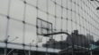 Handheld shot of basketball hoop seen from fence. Sports equipment against buildings. Court is against sky in New York city.