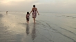 Mother and daughter walk down panoramic beach as camera pans to the sky