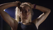 Slow motion, portrait video of adult female racer taking a deep breath and fixing her hair while warming up and mentally preparing for track race about to begin at night