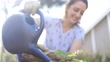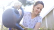 A young woman plants a tree at her home