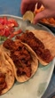 Close-up of a hand holding a taco with chicken filling. Plate with tacos, lime slice in the background. Social media style video taken on a smartphone.
