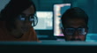 Closeup of Tech team professionals collaborate discuss software development strategies late night in modern office. Software developer, artificial intelligence and programming. - 4K Bildbanksvideo