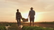 SLO MO Par bär en låda full av grönsaker över ett fält vid solnedgången - 4K Bildbanksvideo