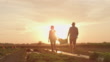 Slow motion shot of an unrecognizable couple carries a crate full of freshly picked vegetables across a field at sunset. Shoot in 8K resolution.