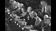 Delegates seated at table / delegates at tables, others seated behind / various shots closer view delegates including US Deputy Secretary of State Edward Stettinius and Secretary of State Cordell Hull / delegates, most military / four delegates at table / delegates including Admiral Percy Noble and Sir Alexander Cadogan (wearing eyeglasses); Cadogan hands paper to Noble / Stettinius with State Department official Leo Pasvolsky and US diplomat Joseph Grew, the latter two holding pipes / pan Andrei Gromyko and the Soviet delegation / delegates / delegates, some clapping / group of photographers in middle of delegates at tables / VS delegates at tables, with VO of conversations, some in Russian / MS delegates, some military / delegates / delegates seated in room; they all stand and start to leave / delegates seated with few in process of sitting; pan delegates; VO gavel bangs, bringing session to order / Note: exact day not known