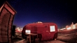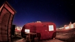 The bright night sky moves above a small trailer in the remote desert, near Marfa, Texas. Meteors (shooting stars) streak across the sky during the night, as several hours pass, condensed into a few seconds using a long-exposure timelapse technique. Vivid colors and bright lights.