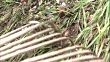 A farmer uses a rake to look for a butterbur sprout in a forest.