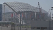 WS Fisht Olympic Stadium, flags on flag poles, construction cranes.