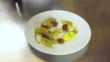 Steady close up shot of a chef preparing the plate to serve fresh handmade ravioli with eggplant sauce, confit tomatoes, chives and olive oil in a restaurant Tuscany, Italy.