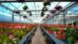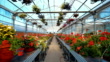 Closeup wide angle of greenhouse potted flower plants. There are many flower sorts on the stalls and hanging from the ceiling construction in the frame with an aisle in the middle.
