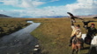 Group of Kazakh eagle hunters riding horses with golden eagle spreading wings in front of river Bayan Olgii, West Mongolia - 4K Bildbanksvideo