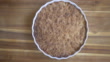 slow motion view of home made apple crumble on wooden board