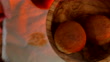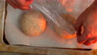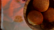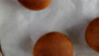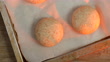 Leavened dough of brown buns. Parchment paper on baking sheet. Putting baked brown buns in olive wood bowl.
