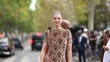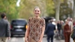PARIS, FRANCE - SEPTEMBER 28: (SLOW-MO) Josephine Japy wears a brown asymmetric dress with printed patterns and fringes, outside Rabanne, during the Womenswear Spring/Summer 2024 as part of Paris Fashion Week on September 28, 2023 in Paris, France. (Footage by Edward Berthelot/Getty Images)