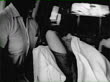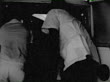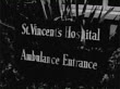 21-Jul-1963 B/W MONTAGE Beachfront home of Spencer Tracy in Malibu / Two Ford Thunderbird automobiles parked in car port. MS St. Vincent's Hospital Ambulance Entrance sign / PAN MS two white male paramedics unloading gurney / Los Angeles, California