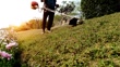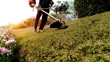 4K Video : wide shot of a man cutting grass with grass cutter in the backyard on sunny day.