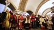KYIV, UKRAINE - DECEMBER 25: Members of “Kyiv Kolyada" community sing carols on the platform on December 25, 2022 in Kyiv, Ukraine. The "Kyiv Kolyada" community led by Oksana Sobko held a traditional Ukrainian carol on the Zoloti Vorota (Golden Gate) metro station platform during an air raid. The particifestival participant's additional Ukrainian carols and collected money to help the Armed Forces. (Footage by Yurii Stefanyak/Global Images Ukraine via Getty Images)