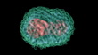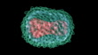 Animated model of a monkeypox virus. The virus has a core (pink) that contains its double-stranded DNA genome. Around this is a protein coat and an outer envelope. It is a large virus, with dimensions of 250x200 nanometres. Infection causes the contagious disease monkeypox, which causes fever followed by a rash, like a milder version of the related smallpox. It is endemic to west and central Africa, but can cause outbreaks in other regions