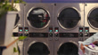 A young mother and her daughter load the washing machine while a camera pans over to others folding laundry at the table of the laundromat.