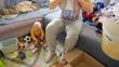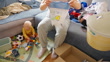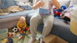 Handheld High Angle Shot Of Mother Folding Clothes While Toddler Son Playing With Toys In Living Room At Apartment
