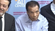 MS ZI CU TD TU Muhammad Ali making fist, posing for paparazzi with the Mayor of Louisville, Kentucky Greg Fischer, Len Amato, Donald Lassere & biographer/photographer Howard Bingham on the red