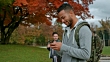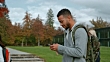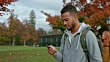 Wide tracking shot of a multi ethnic male student walking through a park while texting and other students are passing him by. Shot in Slovenia.