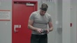 A fit Caucasian man uses a dynamometer with a digital display to test his grip strength while at the gym.