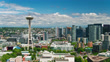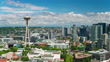 Aerial establishing shot of Seattle, Washington on a sunny day in summer from over Lower Queen Anne, also referred to as Uptown, and looking east towards the Central Business District and Seattle Center, where the Space Needle is surrounded by other attractions like the Museum of Pop Culture and the Pacific Science Center.