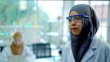 Slow Motion Shot Of Muslim Female Scientist Drawing Formula Chemical On Transparent Board And Looking To The Camera