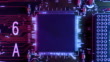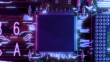 A futuristic neon coloured motherboard of a computer full of computer chips, wired connections and CPU. Animated digital information and data moving across the motherboard.