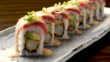 Sushi roll close up: Oba Roll Crispy salmon, avocado topped with salmon, parrillera, jalapeño sauce, chalaquita