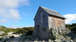 Pan of grand mountain landscape scene with wooden shelter cabin in the wilderness of Tasmania.