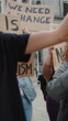 People are marching on strike against racism in the city. They are holding cardboard signs.