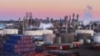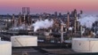 Aerial shot of a steaming oil refinery at dusk in the industrial complex around the Port of Los Angeles.