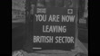 Title card: "Report From Berlin-Paris-Europe's Days of Firmness and Challenge" / arrival of Gen. Matthew Ridgway, Supreme Allied Commander in Europe, followed by group, line of soldiers on side, people behind barricades on other side, Army plane in bg; he is met by Gen. Dwight Eisenhower, who salutes him / MS Eisenhower, wearing dark glasses, walks with Ridgway and Rene Pleven, French Minister of Defense; Ridgway salutes, then Eisenhower / Eisenhower and Ridgway shaking hands, / NATO flags flying / Ridgway shaking hands with officer, then his Chief of Staff General Alfred Guenther, with French officer on other side, at NATO headquarters / officers entering headquarters / French foreign office building, people on sidewalk / VS officials sitting and standing around conference table / closer shot including West German Chancellor Konrad Adenauer / officials at table / Adenauer preparing to sign European Defense Pact amid others / Adenauer signing / beside him Belgium representative signing / men standing at table / French Foreign Minister Robert Schuman signing / room / officials at table / room / animated map of Germany and surrounding countries; shading of East Germany, then hammer and sickle and divisions of West Germany with flags of occupying countries / various shots Potsdamer Platz public square in Berlin from 1948 / pan down street sign for Potsdamer Platz to pedestrians / animated map of Berlin; flags of sectors of occupying countries fade in / sign "You Are Now Leaving British Sector" / CU sign / sign "Helmstedt US Zone British Zone Russian Zone," looks like tank atop small building in bg / sign "You Are Now Leaving The American Sector", same in Russian and French beneath / empty highway / pan from sign "British Zone" across highway to Berlin sign / boat in canal, building and crane in bg / LS canal with barges and boats / crowd / MS people / crowd in street with some debris, can see back of streetcar / people and traffic in street