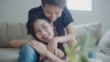 Affectionate lesbian couple cuddling on sofa together in living room at home. Bangkok, Thailand.