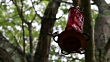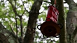 Cranston, Rhode Island - June 26, 2016: A ruby-throated hummingbird hovers while drinking from an antique style glass feeder against a bokeh background and then shoot up through the trees.