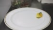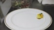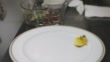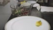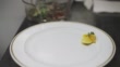 Close up of the salad arranging by chef , grilled chicken with orange , rucola , parsley , baby spinach , cherry tomato and lemon on the white plate