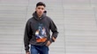 DUSSELDORF, GERMANY - JUNE 30: (SLOW-MO) San Diego Pooth wearing a grey hoodie with multicolored bird front print by Heron Preston, blue denim jeans pants by Levi’s and white, dark blue and brown Air Jordan 1 sneaker by Nike during a street style shooting on June 30, 2021 in Dusseldorf, Germany. (Footage by Streetstyleshooters/Getty Images)