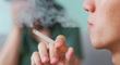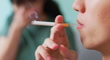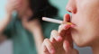 Closeup side view asian man smoking while woman get second hand smoke problem