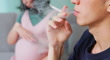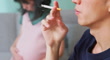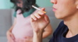 Closeup side view asian man smoking while pregnant woman and unbirth baby get second hand smoke problem