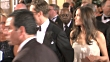 2009 GOLDEN GLOBES AWARDS RED CARPET: side angle, MCU- Brad Pitt and Angelina Jolie walking red carpet: Angelina smiles, waves and nods as Pitt looks in opposite direction