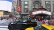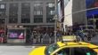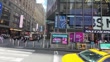 Slow Motion Of Yellow Taxi Driving Past Raising Cane's Chicken Fingers, Bubba Gump Shrimp, Taco Bell, Lids And Hard Rock Cafe, And Chase Bank On 7th Avenue In Times Square, Utility Worker Standing Atop The Bucket Truck In The Background - 4K Bildbanksvideo