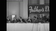 Slow pan of honorees seated at banquet table: actor William T Orr, Warner Brothers president Jack L. Warner, Lt. Gen. James Doolittle, actor Melvyn Douglas, former vice preside Alben Barkley, Senator Henry Cabot Lodge, MC Alvin Austin, US Ambassador to UN Henry Cabot Lodge gets Father of the Year medal from National Father's Day Committee pinned on by British permanent UN representative Gladwyn Jebb, boxer Rocky Marciano, opera singer Ezio Pinza, journalist and tv show host John Daly, maybe J. Fred Vollmer at end / banner above reads Father's Day / Note: exact day not known