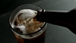 Soda being poured into a glass that is full of ice