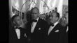 Standing together posing for photo opportunity from left to right: co-founder of Metro-Goldwyn-Mayer studios Louis B. Mayer; unidentified man; director/producer Mervyn LeRoy; National Conference of Christians and Jews president Dr. Everett R. Clinchy; president of Warner Brothers Studios Jack L. Warner; and comedian Jack Benny; behind them is a banner "World Brotherhood" / SOTs Clinchy speaks to camera about courage and idealism of people in film industry and the film industry promoting human brotherhood